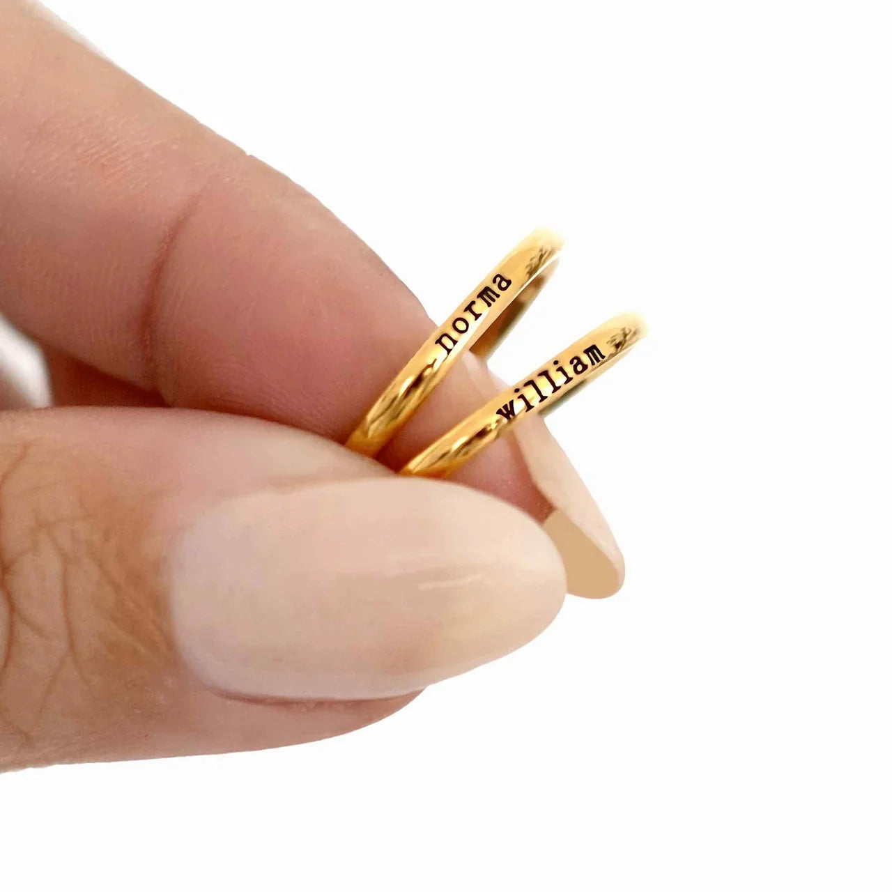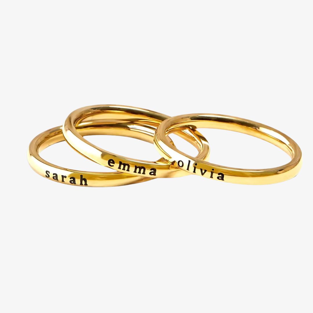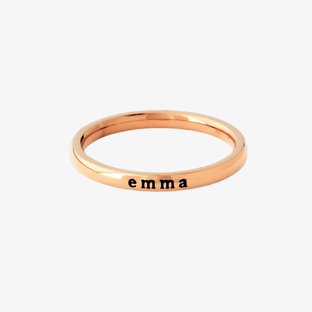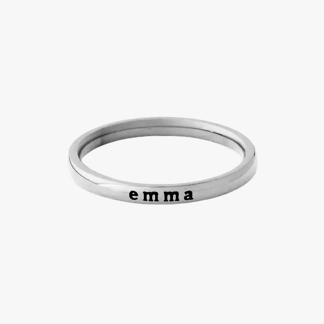 This delicate stackable ring can be personalized with any name or meaningful word in a sleek, modern font. Its minimalist design allows effortless layering, making it a refined addition to your everyday jewelry collection or a thoughtful, customized gift. Crafted to complement your style with subtle elegance.