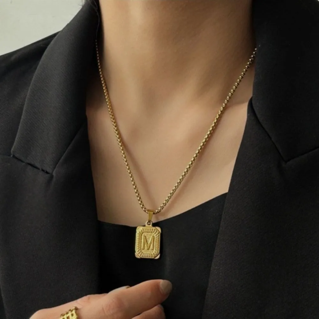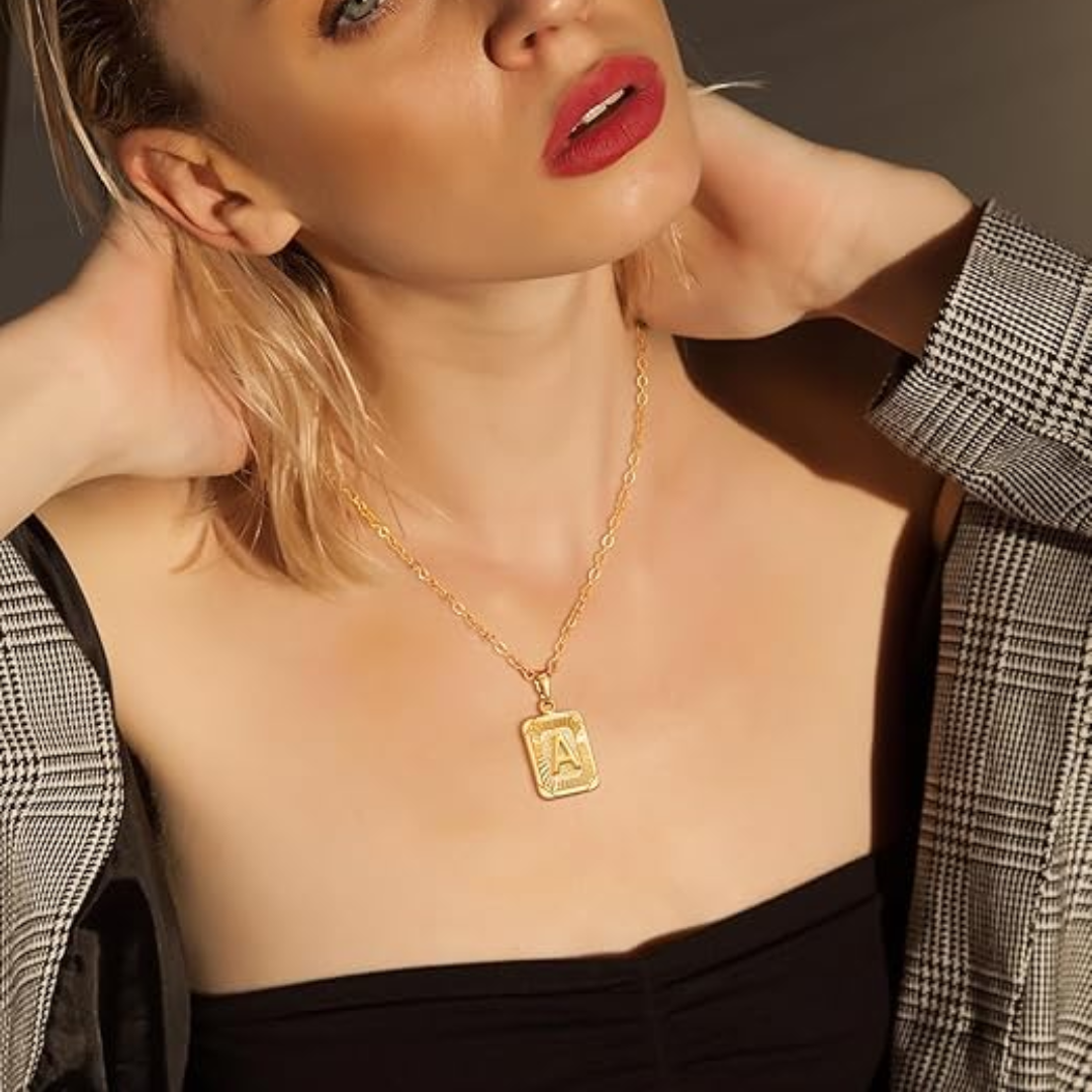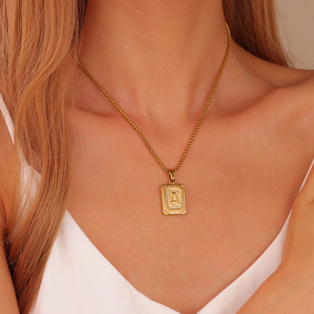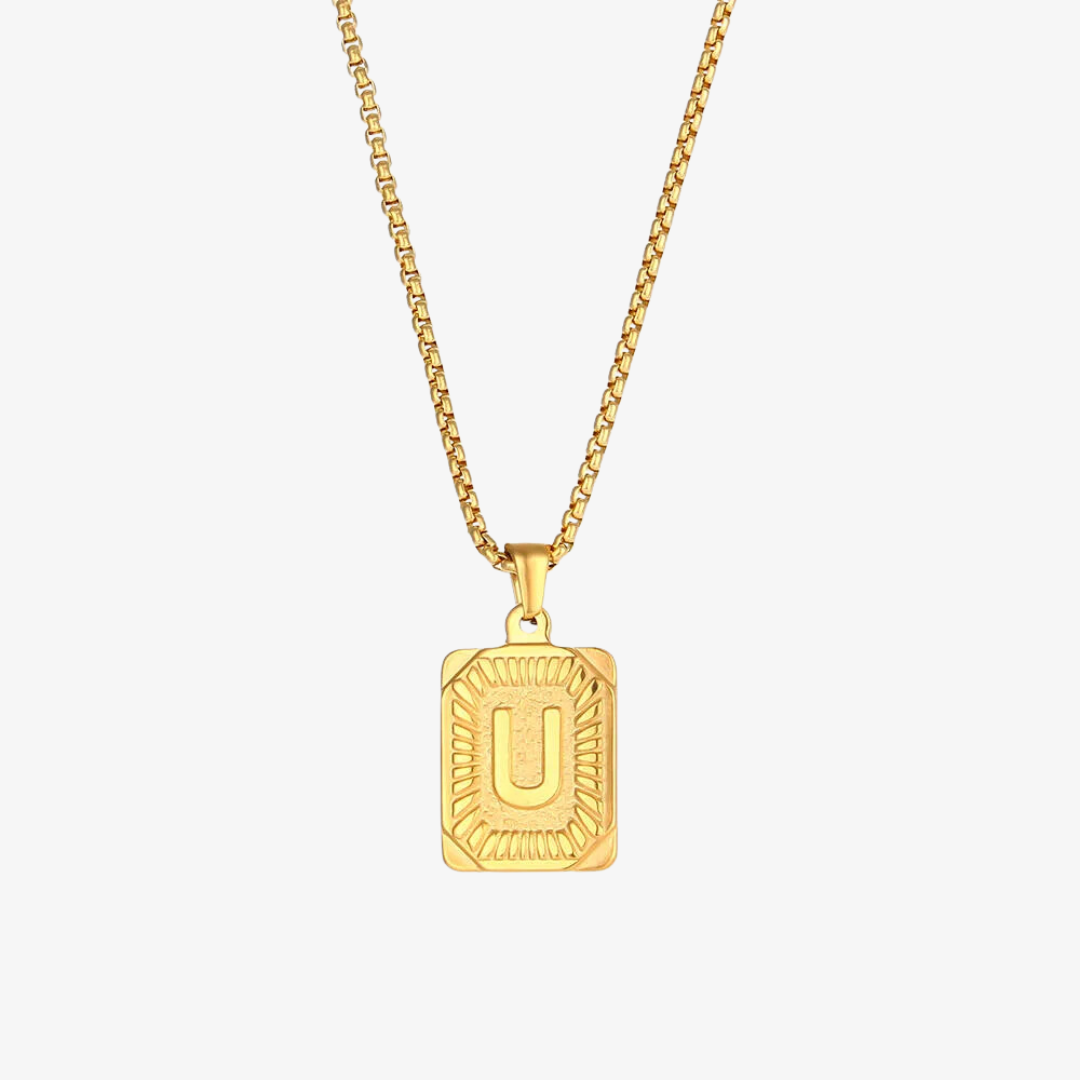 Elevate your attire with the distinguished Azura Square Initial Letter Pendant Monogram Necklace. This elegant personalized piece showcases your chosen letter, adding a touch of individuality to your look. Exquisitely crafted, this sophisticated accessory transitions seamlessly from everyday wear to special occasions, embodying timeless style and refined taste.