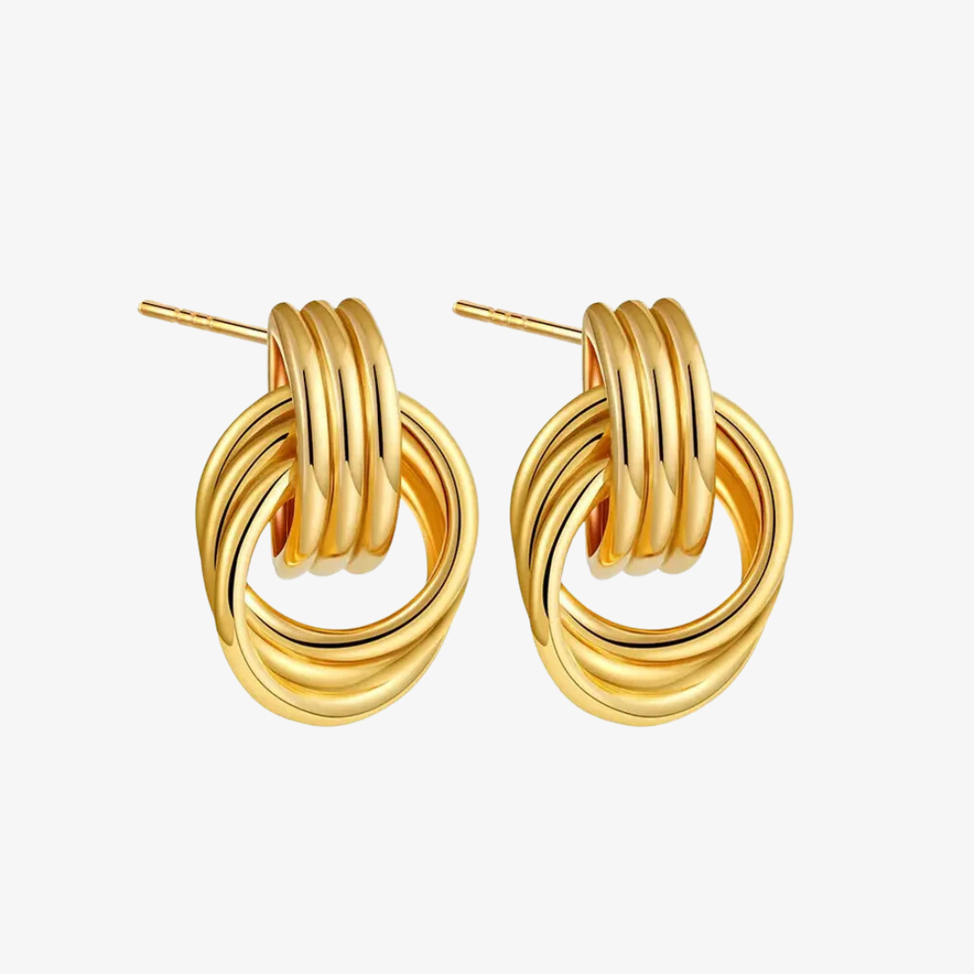 Effortlessly exuding sophistication and timeless allure, the Athena Chunky Knot Earrings in Gold add a subtle sparkle to any ensemble. Crafted with meticulous attention to detail from premium 18k water-resistant gold-plated stainless steel, these earrings feature interlocking hoops that create a refined and captivating effect, perfect for any occasion.