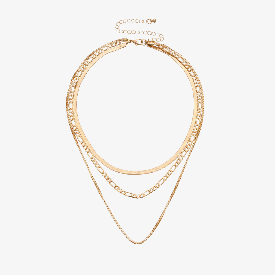 This exquisite necklace features a boho-inspired design with a herringbone, cuban, and chain necklace, creating a luxurious triple-layered effect. Its adjustable feature allows for the perfect fit, making it a must-have for any fashion-forward individual. Elevate your style with this statement piece.