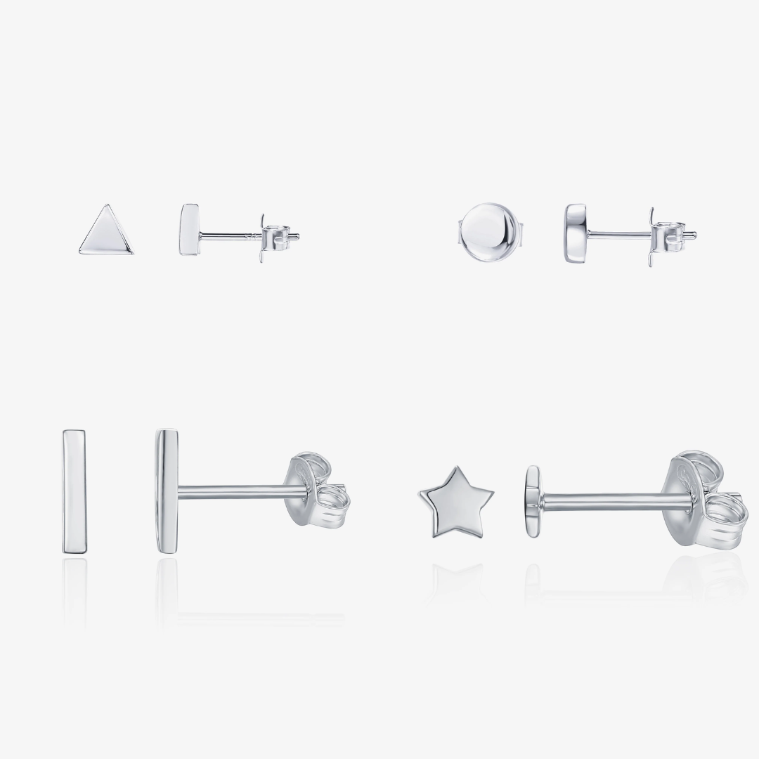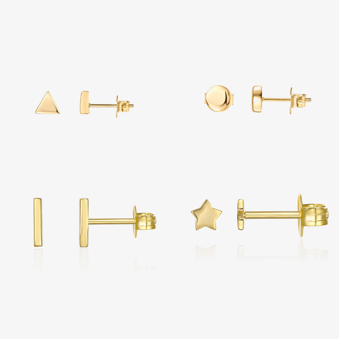 Defy ordinary with our Geometric Minimalist Stud Pack. This rebellious quartet—triangle, circle, bar, and star—breaks all the rules while maintaining razor-sharp elegance. These aren't just earrings; they're weapons of mass distinction in your style arsenal. Dare to transform even the most basic outfit into a bold statement with these unapologetically luxe pieces.