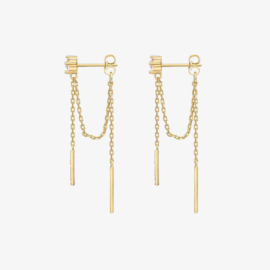Defy conventional elegance with our Mini Cubic Zirconia Chained Bar Earrings. These rebellious 18k gold-plated stunners showcase a fearless 4mm cubic zirconia that refuses to be overlooked. The provocative combination of a bold back chain and its daring front counterpart creates an unapologetically eye-catching statement. Not for the timid—these earrings are for those who dare to stand out in any crowd.