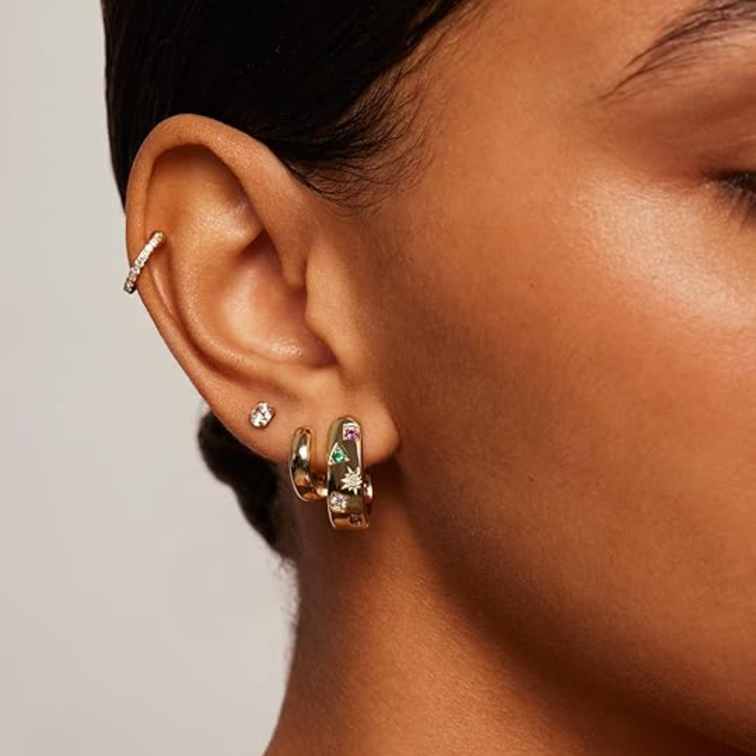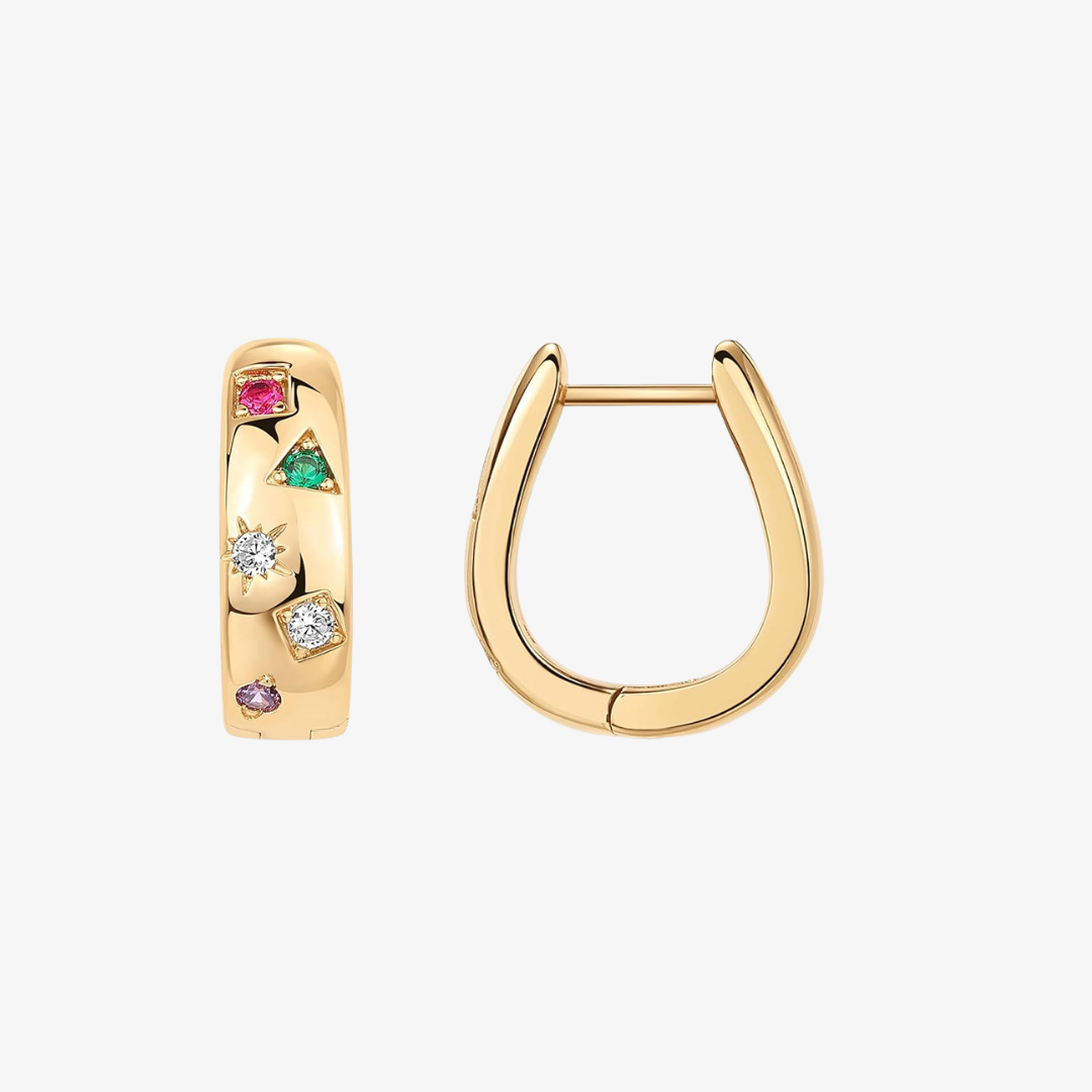 Transform your ensemble with our Star Colored Chunky Huggies. These sophisticated hoops showcase dazzling multi-hued cubic zirconia stones, offering both refinement and statement appeal. An essential accessory for the discerning collector, these substantial earrings infuse any attire with a touch of luxurious brilliance. Enhance your sartorial presence with these captivating, attention-commanding pieces.