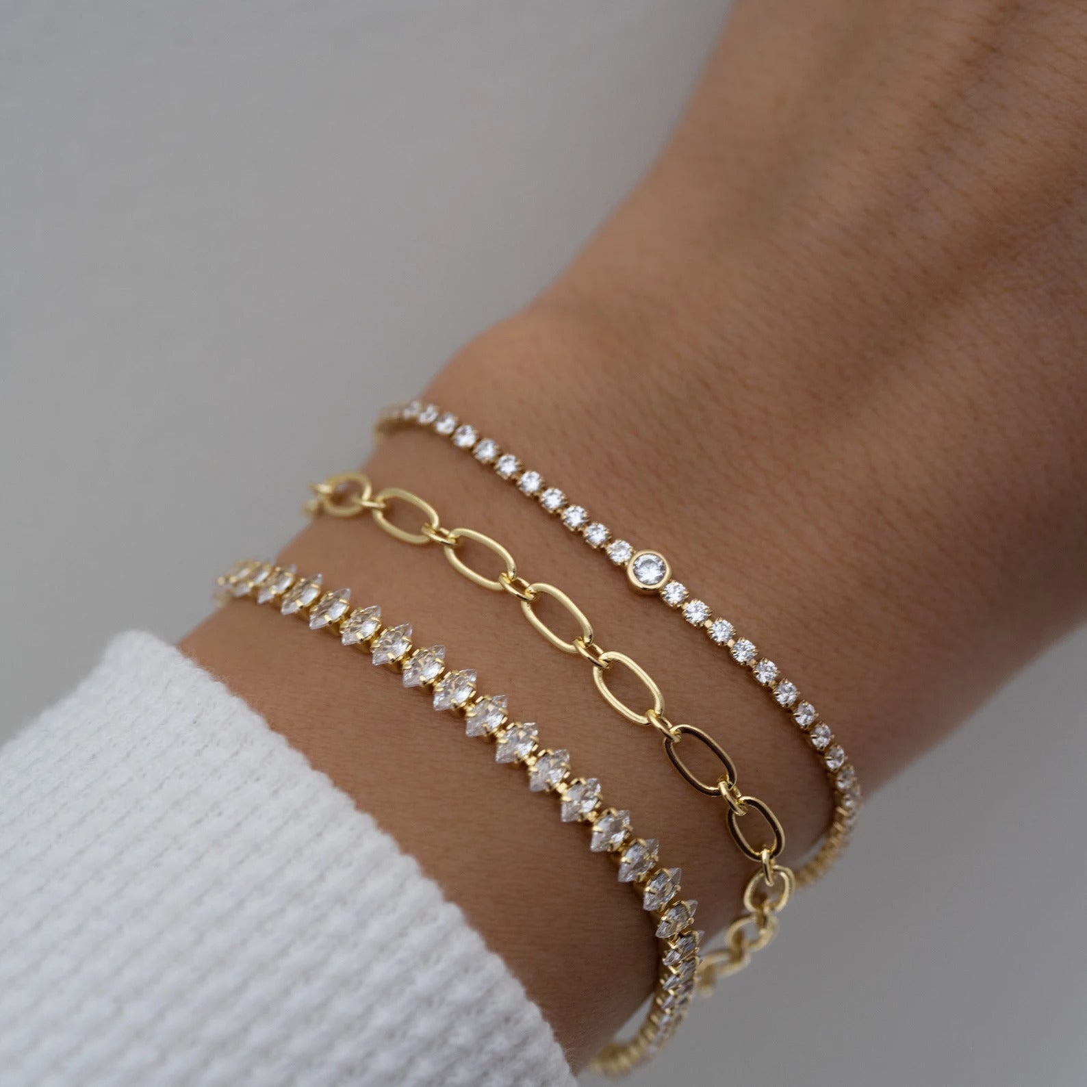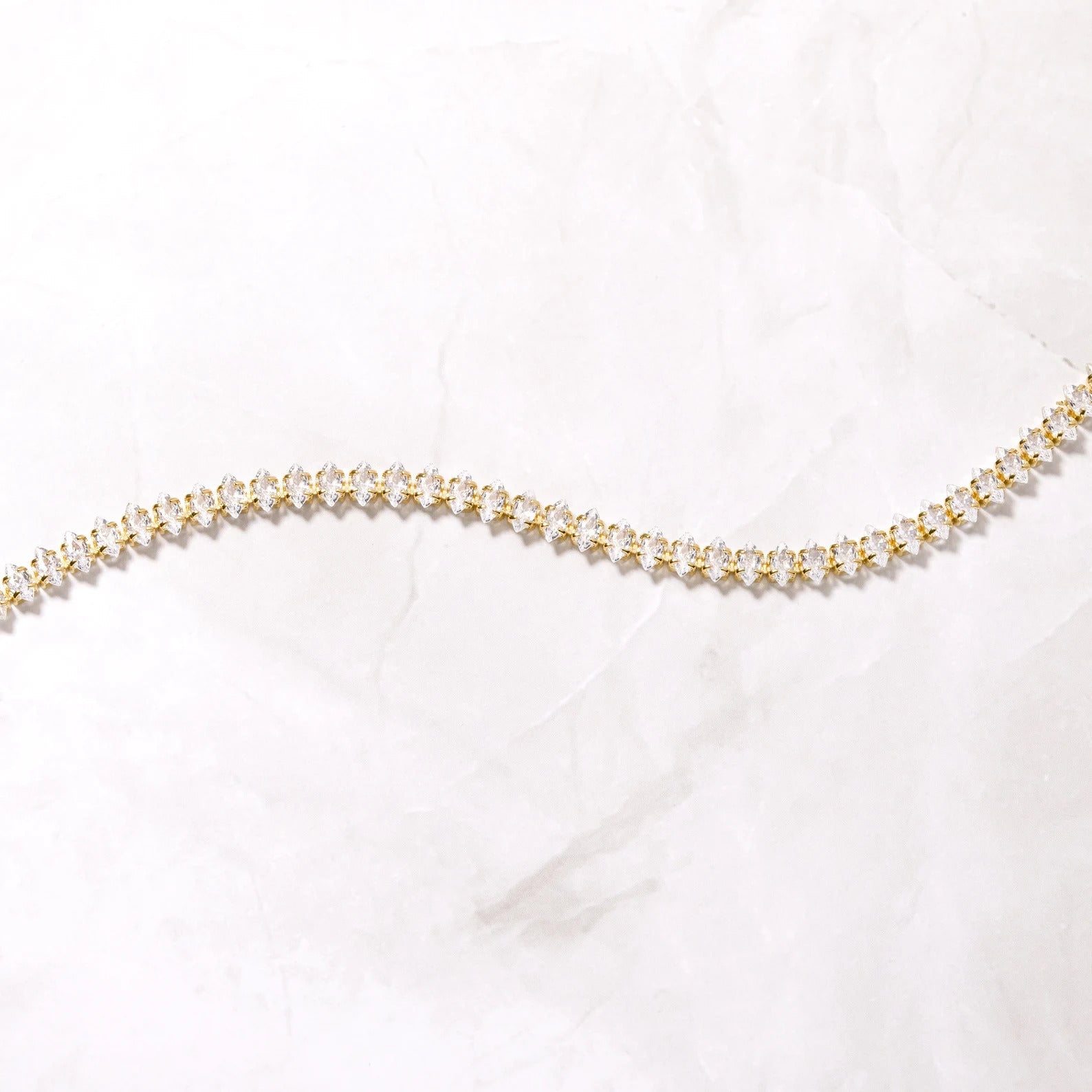 Enhance this traditional tennis bracelet with a contemporary touch - The bracelet boasts a unique elongated and curved style, embellished with marquise-cut stones measuring 4mm or oval-cut stones measuring 5mm. Whether worn alone or paired with other accessories, this versatile piece exudes timeless elegance and can be customized to your desired length with its adjustable chain.