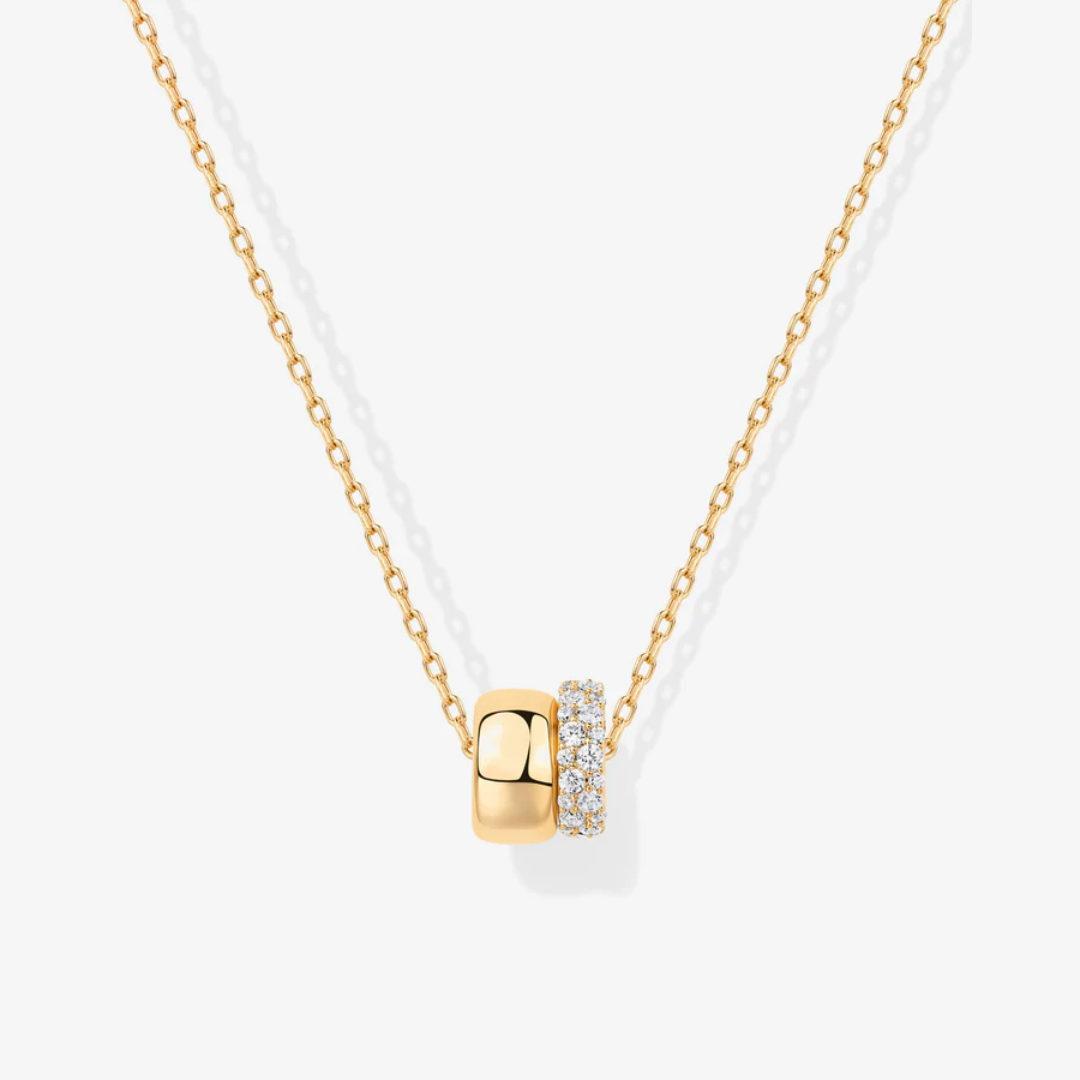 Enhance your ensemble with the Soho Pendant Necklace, a sophisticated dual-toned accessory showcasing two contrasting rondelle pendants—one minimalist in design, the other brilliantly embellished with premium AAAAA cubic zirconia stones. The adjustable sliding chain offers adaptable styling options for diverse settings. This refined piece brings understated luxury to any attire, effortlessly transitioning from day to evening wear.